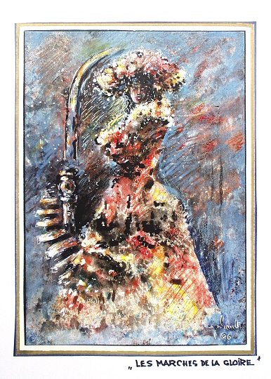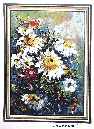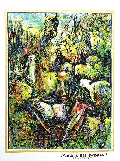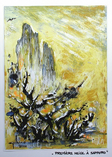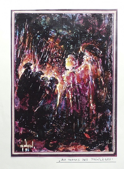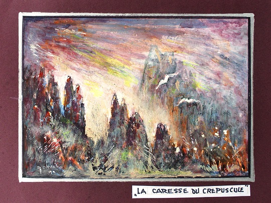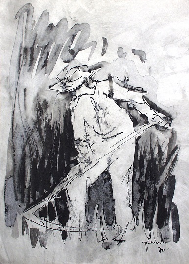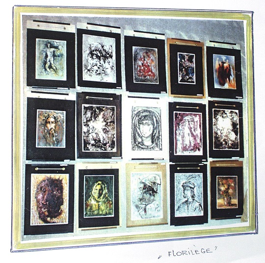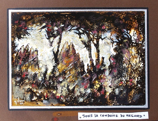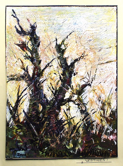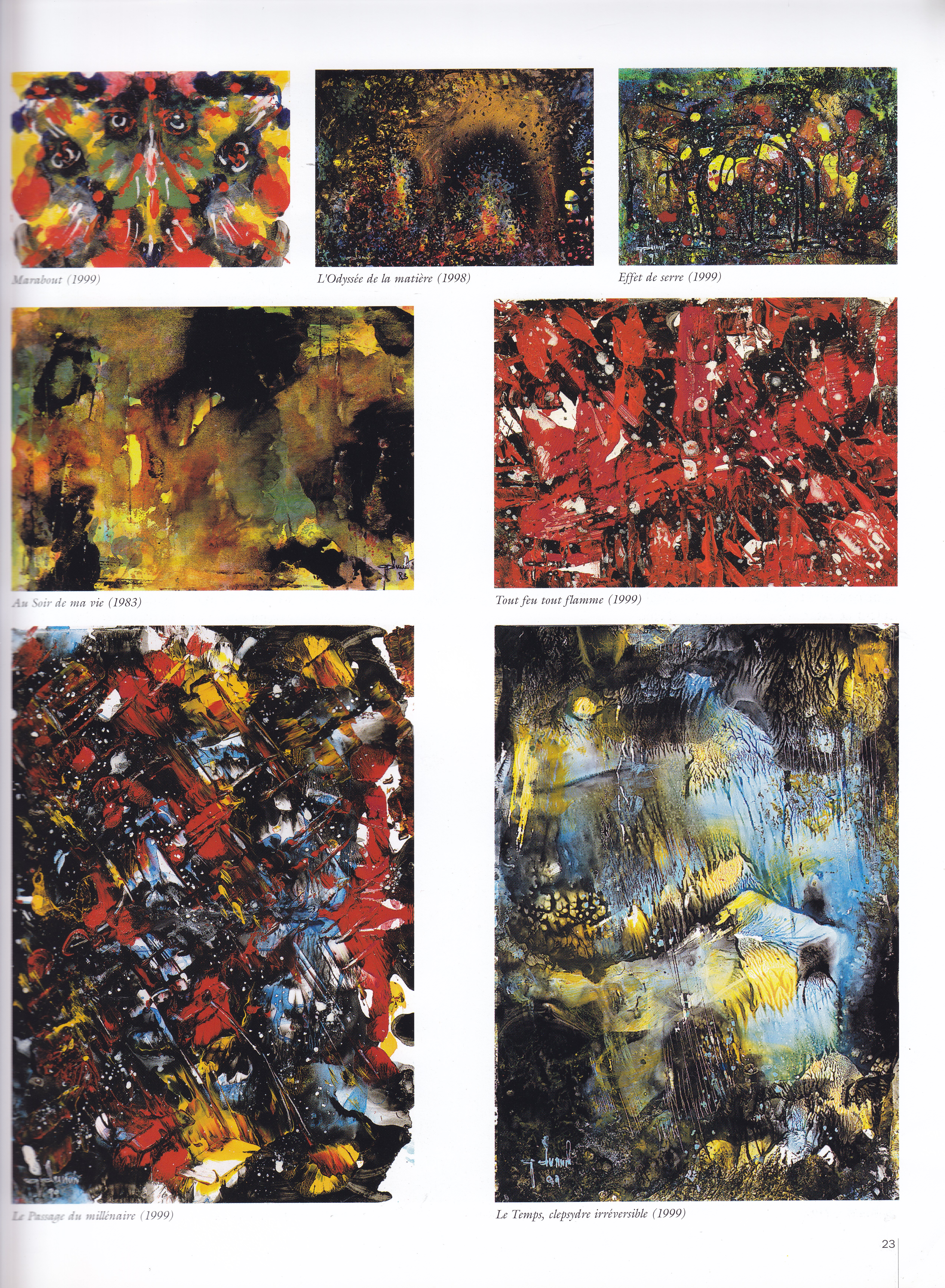 seduced by surrealism, with an obvious note of “action painting,” mystical, evocative, and troubled, with symbolic and