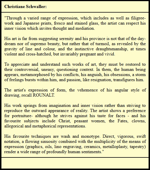 The transition from one technique to another, ... gives to his feelings an exalting participation, either shadowed by picassien gray or enlightened by a ray from within himself ...